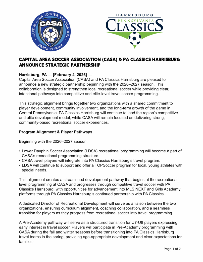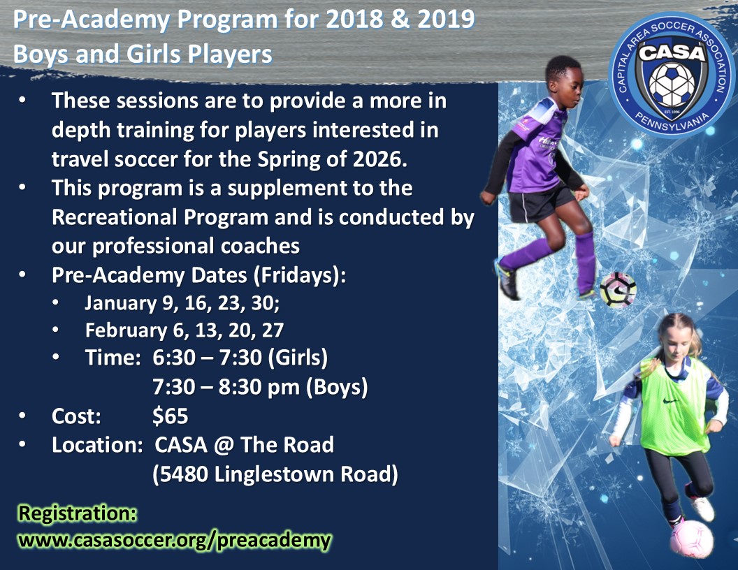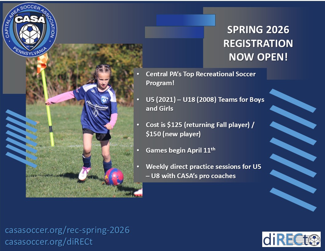 CASA is affiliated with Central Pennsylvania Youth Soccer League (CPYSL), Atlantic Premier League (APL), and Elite Development Program (EDP). CASA has organized recreational and travel and premier level programs for boys and girls, in the spring, summer and fall outdoor seasons, using Township and School District fields throughout the area. CASA also offers indoor winter programs at several local facilities.